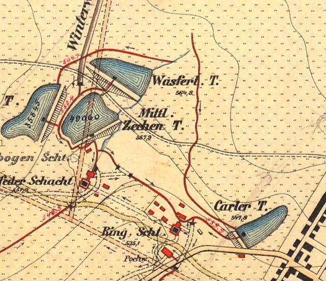 Zellerfeld. Das Wasser aus dem Quellgebiet nördlich des Wasserläufer Teiches fließt über einen Graben zum Oberen Zechenteich, das westlich davon über eine Leitung zum Carler Teich. Als Überlagerung zum Luftbild sandkuhl-3-e_g.kmz (Sandkuhl 1893) |