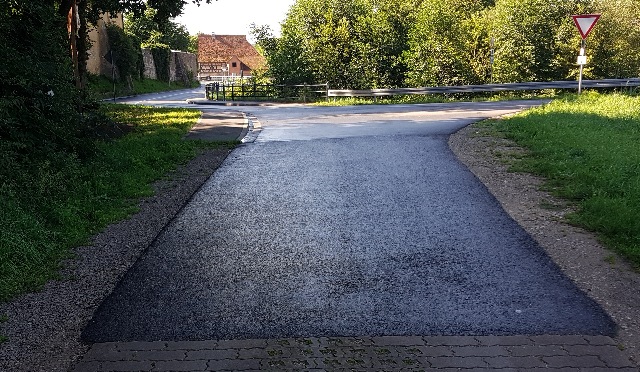 | Abb. 03-01: Richtung Forchheim kurz vor Weilersbach, es sind die Spuren von zwei Leitungen zu finden: die erste ist etwa einen Meter rechts vom Straßenrand, die zweite in der linken Hälfte des Radweges just before Weilersbach, there are traces of two lines: the first is about one metre to the right of the roadside, the second in the left half of the cycle path. (FB) |