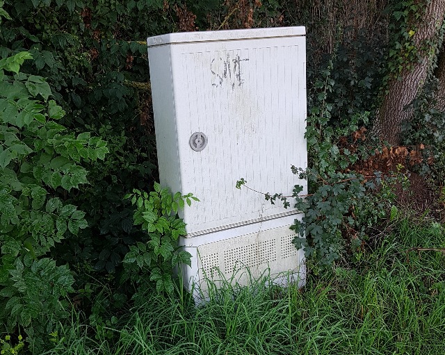 | Abb. 03-18: 12.08.2023 Blick nach Süden in Richtung Pretzfeld, möglicher Hinweis für die Nutzung der Leitung: ein Kasten nach 760 m Strecke kommt dieser Schaltkasten, ein baugleicher Kasten steht in Pretzfeld am Ende dieses Weges. Looking south towards Pretzfeld, a hint for the use of the line: cable ? after 760m of track comes this switch box, an identical box stands in Pretzfeld at the end of this track. (FB) |