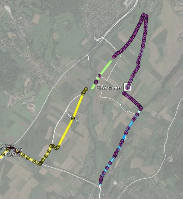 rot: 10.8.2023, gelb: 11.8.2023 Die gemutete Leitung geht weiter über Feldwege und Felder in Richtung Ebermannstadt (rechts). The area of the junction with the B470 is on the left. There you can perceive the traces of a pipeline? (yellow) to be muted. red: 10.8.2023, yellow: 11.8.2023 The muted pipeline continues along field paths and fields in the direction of Ebermannstadt (right). (FB) |