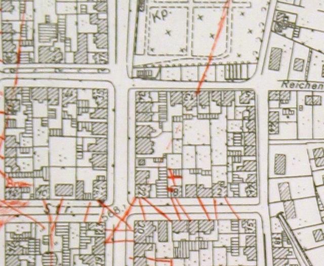 Abb. 10 Durch das mittlere Straßenviertel (mit Hausnummer 22 bis 34) zieht sich ein gemuteter Stollen hindurch bis zum nördlichen Ende des Friedhofes. (FB) |