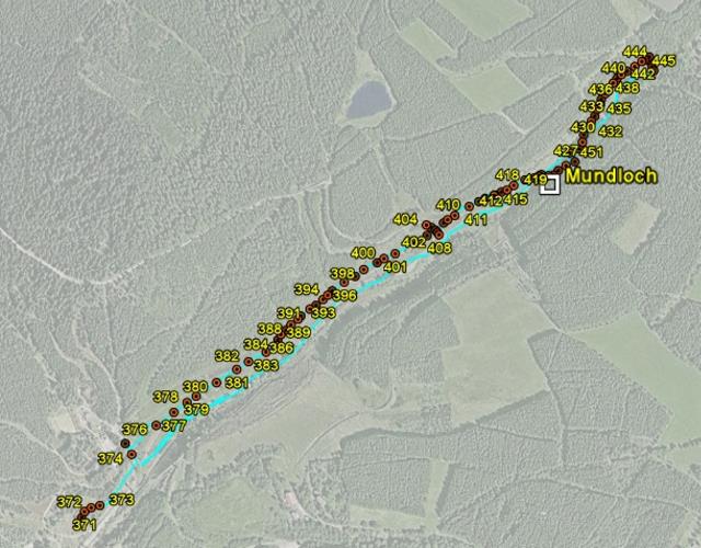 ein Lichtloch? Die Spurverfolgung bis 374 war sehr schwierig, da Hochspannungskabel vom Wasserkraftwerk im Erdboden liegen. Die gefundene Spur ist breit und fühlt sich weich an. An zwei Stellen wurden mehrere Echos markiert. (404-408) und (447-450) Bei 423 gibt es ein Stollenmundloch. Ab 445 geht die Spur vermutlich weiter unterhalb der Ringer-Halde. Das Wetter: leichter Regen, 8 Grad (FB) |