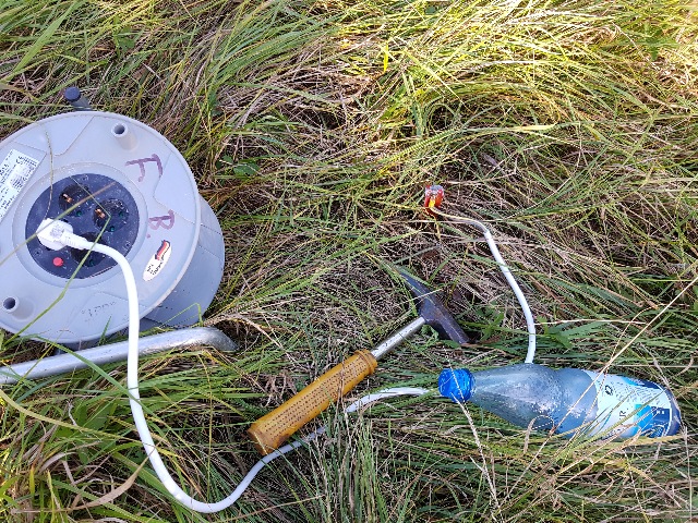 | Abb. 02-06: Der andere Pol des Generators ist über die Kabeltrommel mit einem Zelthäring verbunden. Zur besseren elektrischen Leitfähigkeit diente das Befeuchten des Erdreichs an der Kontaktstelle mit Wasser aus der Flasche. (FB) |