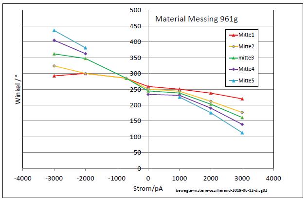 | Abb. 11-03: Wiederholung von Abb. 11-01 mit besseren Geräten. Messingzylinder 961g Ausrichtung der Bewegung West-Ost. Hin- und Herbewegung mit 0,3 U/Minute, (etwa 90° an der Kurbel) Fahrweg des Pleuels und der Probe ca. 55 mm. Die Richtung der Mitte des Öffnungswinkels wandert bei jedem Hub entweder CCW oder CW weg vom Ausgangswinkel. Über einen extrem kleinen Gleichstrom in den Helmholtz-Spulen lassen sich Stärke und Vorzeichung der Winkeländerung beeinflussen. Strom in pA, Strom mit positivem Vorzeichen bewirkt eine Drehung CW, mit negativem CCW. Fließt kein Strom gibt es eine schwache Drehung CCW. Mit -670 pA läßt sich die "natürliche" Rotation kompensieren. Dann bleibt die Struktur bei jedem Hub ortsfest. Im Vergleich zum Erdmagnetfeld von 40 µT ist das durch die Spule bei 3000 pA zusätzlich erzeugte Feld etwa um den Faktor von 400 Millionen schwächer! (FB) |