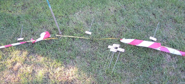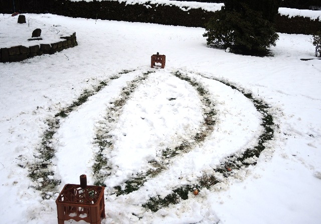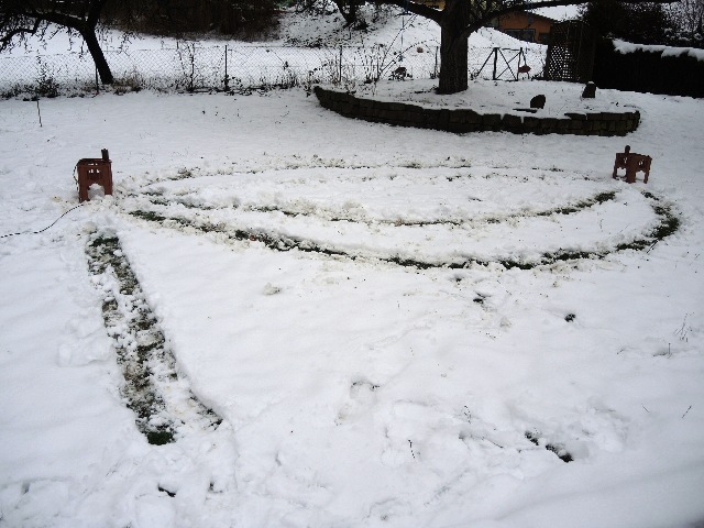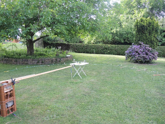 | Abb. 01-06: Ein Satz mit 8 Teelichtern. Im Hintergrund sind am Meßkreis mit Radius 4 m die spürbaren Strukturen ausgelegt. (FB) |