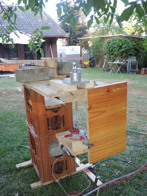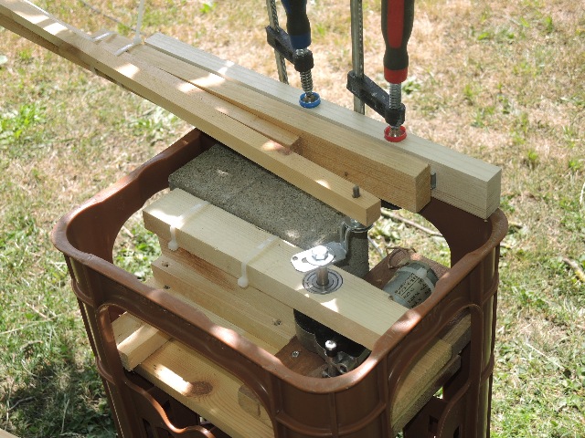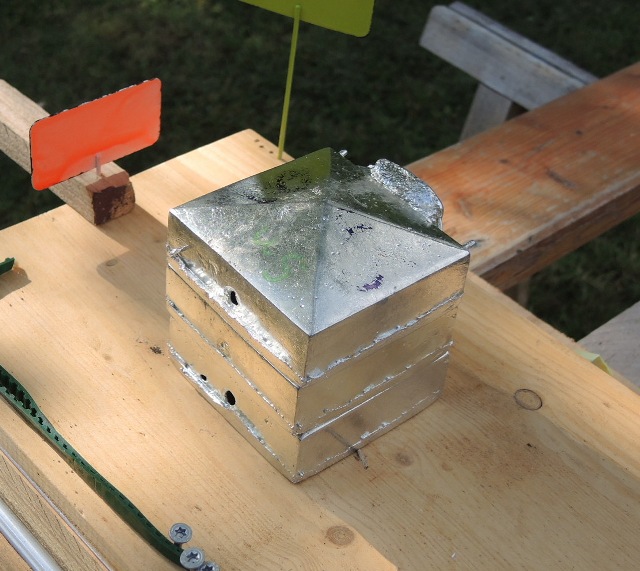 Fahrbedingungen wie bei Messing 961g. Die Körper haben eine pyramidenförmige Spitze. Stellt man mehrere Körper übereinander, dann vergrößert sich dadurch die Winkelzunahme bei jedem Hub. Stellt man sie nebeneinander, dann bleibt die Winkelzunahme unverändert. Offensichtlich kommt aus den Pyramidenspitzen "etwas" heraus, daß den Effekt beeinflußt. (FB) |