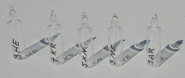 Abb. 01-01: Verschiedene Edelgase in Glasampullen: Helium, Krypton, Xenon, Neon, Argon siehe auch edelgas-ampullen.htm (FB)