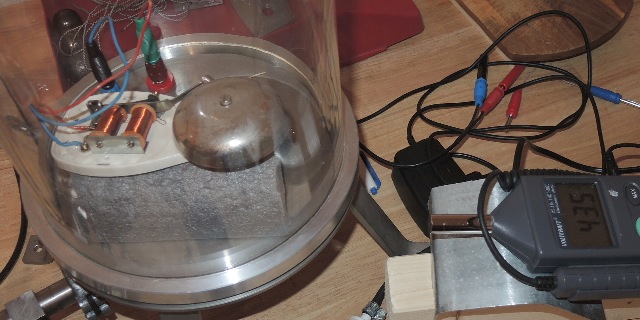 Abb. 00-02: Vakuumglocke, Klingel auf Schaumstoffunterlage und Schallpegel-Meßgerät rechts, Anzeige 43,5 dB (FB)