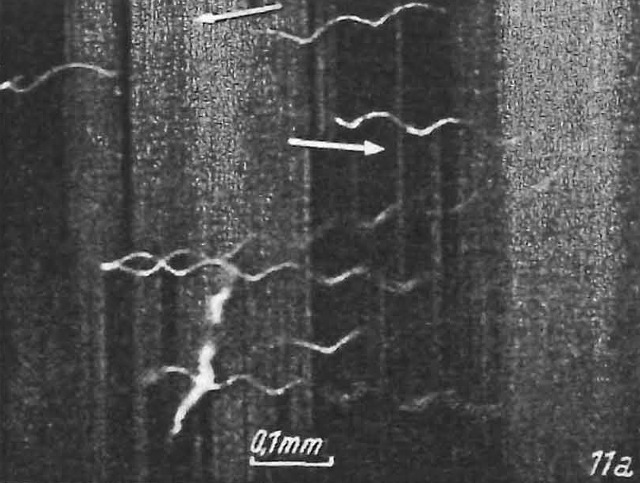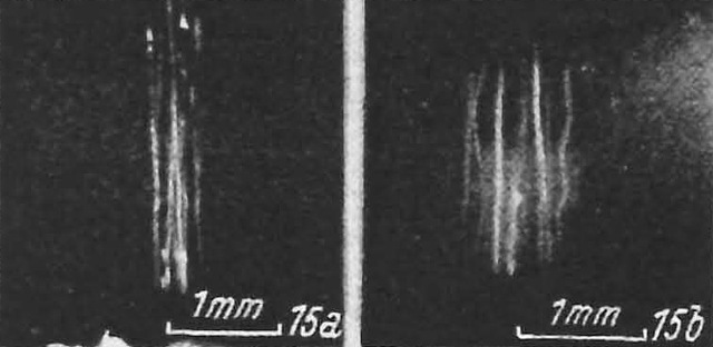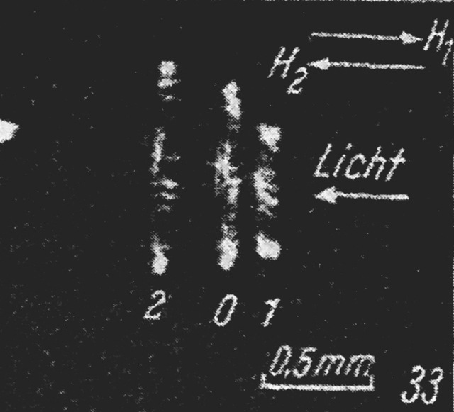 1) Ein Großteil der bisher frei fallenden Teilchen ändert Richtung und Geschwindigkeit seiner Bewegung. Manche Teilchen steigen der Schwerkraft entgegen zur oberen Magnetode, andere bewegen sich schneller als vorher nach unten, wieder andere erscheinen überhaupt keine Beeinflussung zu erfahren. Neben den nur von Pol zu Pol gerichteten Bahnen treten auch andere Formen auf, Schraubenlinien, Sprünge, plötzliche Richtungsänderungen. (Abb. 2) Diese Bewegungen treten auch längere Zeit nach dem Einschalten des Feldes in unveränderter Weise auf. Eine Deutung durch induzierte Ströme im Sinne des Thomsonversuches ist aus mehreren Gründen nicht möglich, erstens bewegen sich die Teilchen zu einem Zeitpunkte noch, wenn dH/dt schon lange Null ist, zweitens zeigen auch Schwefelteilchen die Bewegung und drittens bewegen sich Probekörper gleichzeitig in der Nord-Süd Richtung und in der Süd-Nord Richtung. Wichtig für die spätere Interpretation ist die Tatsache, dass alle beobachteten den Bahnformen eine polare Komponente besitzen. (Abb. 3)