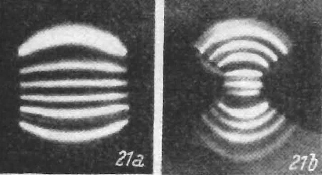 Ansonsten wurde die gleiche Anordnung wie bisher benutzt. Verwendet wurden Legierungen Koerzitivkraft (AlNiCo). Die Polschuhe waren in der von Weiss angegebenen Art abgeschrägt, um eine möglichst große Homogenität des Feldes zu gewährleisten. Die zu untersuchende Flüssigkeit konnte seitlich beleuchtet werden und wurde im Dunkelfeld eines Mikroskops betrachtet.