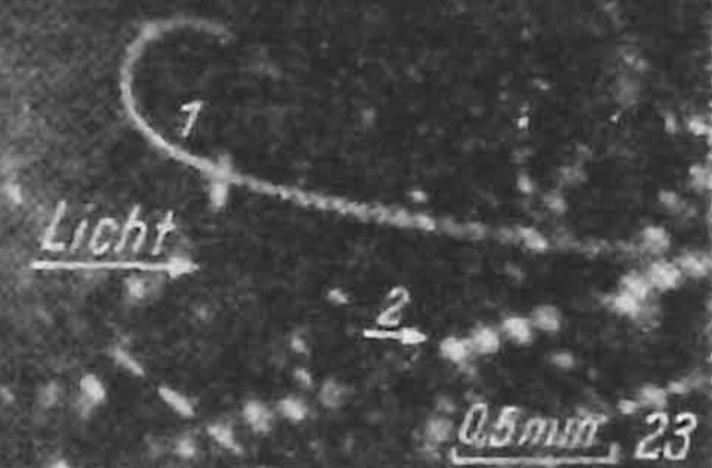 5) eine Abhängigkeit von der Intensität des eingestreuten und für die Beobachtung im Dunkelfeld erforderlichen Lichtes ist vorhanden. Die polare Bewegung findet jedoch auch eindeutig im Dunkeln statt, wie man durch wechselndes Ausschalten und wieder Einschalten der Lichtquelle und Vergleich der Bahn beweisen kann.