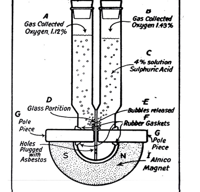Instead, he uses the iron rods as pole pieces, or North and South ends of a magnet — either an electromagnet or a permanent magnet. Bubbles of gas rise through the twin columns of acidulated water, to be collected and analyzed. As might be expected, nearly all of the gas is hydrogen, liberated by a commonplace chemical interaction between the iron rods and sulfuric acid, one percent by volume, in the water. But the phenomenal part of the experiment is that oxygen also turns up, Dr Ehrenhaft recently told the American Physical Society. To be specifc, it is found in clearly measurable proportions ranging from 2 to 12% of the total volume of gases. When the gases obtained with a permanent magnet are separated, the larger proportion of oxygen is found above the north pole of the magnet. After rigorous precautions that seem to rule out all other explanations — including short-circuiting the magnet poles with wire, so that the poles will be at the same electric potential — Dr Ehrenhaft concludes that there is only one place the oxygen can come from. And that is from the water decomposed with a magnet! Without a magnet, pure hydrogen is evolved.
