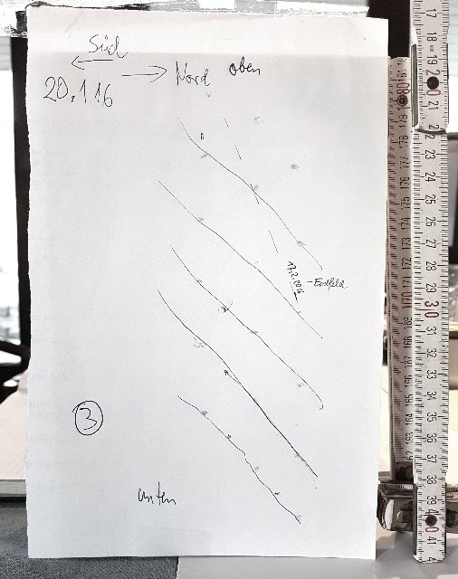 horizontal verlaufen. Die Linie der durch die Ebene geschnittenen Strukturen hat eine Neigung von etw 53° zur Horizontalen. Damit könnte sie senkrecht zur Erdachse und nicht in Richtung der Inklination zeigen. (FB) |
