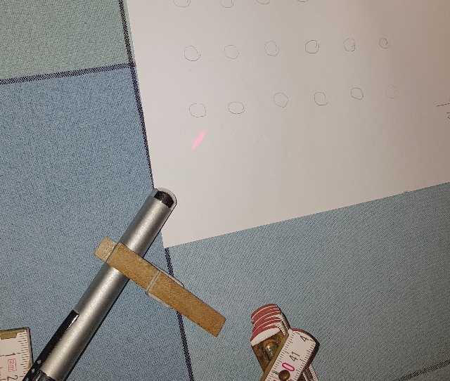 Ergänzung 17.2.2016 Blick nach Westen, links Süden, rechts Norden. Das Papier ist an einem Buch befestigt. Die Verbindungslinien der Punkte vom 20.1.2016 haben eine Neigung von etwa 50°. Die korrigierte Version vom 17.2.2016 zeigt die Inklination des Erdfeldes mit einer Neigung von 70° Das entspricht etwa der Inklination am Ort. (FB) |