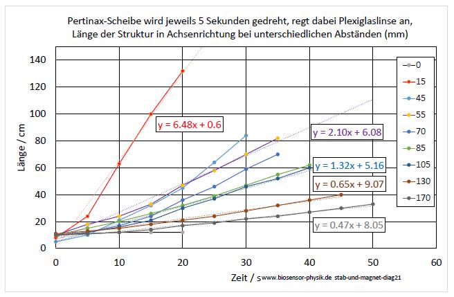 Mit zunehmender Rotationsgeschwindigkeit oder Dauer der Rotation wächst die Länge der Struktur an,