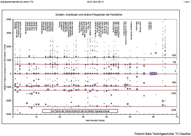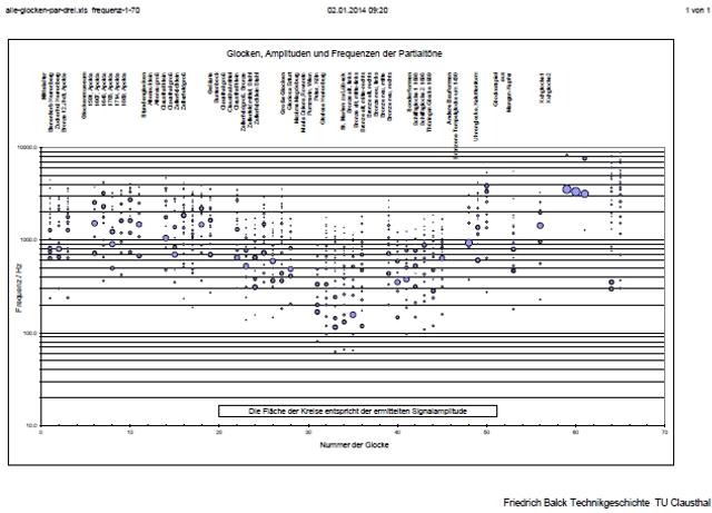 Frequenzen Die Fläche der Kreise entspricht der ermittelten Signalamplitude (Lautstärke). Bei vielen ist die Mollterz (dritte von unten) sehr viel kräftiger als die Prime (zweite von unten). Oberhalb von der Glocke 11 scheint ein anderes Partialtonspektrum vorzuliegen. (andere Bauform?) (FB) |
