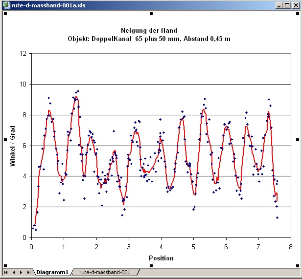 in der Bildmitte etwa bei 3,6 Metern. blumenkasten Der Winkel der Hand variiert um einige Grad. (Meßdaten und rote Ausgleichslinie). Es gibt gleitende Übergänge. Offensichtlich läßt sich über die Fehlstellung von der Senkrechten die Stärke einer Störung ermitteln. ProportionalRegler Die Streuung der Meßpunkte kommt vermutlich durch die Bewegung beim Gehen. Abhilfe könnte hier die Messung von einem fahrbaren Untersatz aus bieten. zum Vergleich: comunetti Inclination of the rod axis plotted against the position (meter) when dowsing over an almost symmetrical "interference fringes" over two parallel plastic channels. Their center is in the picture center approximately with 3.6 meters. blumenkasten The inclination of the hand varies around some degrees. (Measured data, averaging line (red)). There are sliding transitions. Obviously the strength of a disturbance can be determined using the inclination. ProportionalRegler The scattering of the measuring points is due probably to the movement of the hand when going. This influence could be reduced by driving in a mobile support. to the comparison: comunetti (FB) |