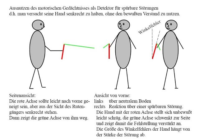 Störung an Using the motoric memory as detector for disturbances i.e. one tries to keep its hand perpendicular without using the consciousness View from the side: The red axis should be bent easily forward, however from the view of the dowser perpendicularly. Then the green axis shows away from him. View from the front: left on neutral ground right reaction over a disturbance. The hand with the red axis unconsciously inclines a little bit, as consequence the green axis swivels to the side and indicates thereby misalignment. The size of the inclination of the hand depends on the strength of the disturbance. (FB) |