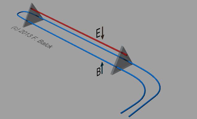 | Abb. 02-04-04: Leitung mit drei Drähten. Sonderfall: durch die beiden unteren Drähte fließt ein Strom, zum oberen Draht liegt eine Spannung an. Das elektrische Feld und das magnetische Feld haben (bis auf das Vorzeichen) gleiche Richtung. Wie wirkt die Resonanz zwischen den Drähten mit den spürbaren Effekten um den fließenden Strom herum und denen, die sich aus der angelegten Spannung ergeben? (FB) |
