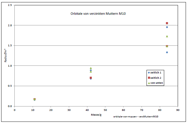 vier / acht Muttern M10, Ausdehnung zur Seite / nach vorne / nach unten, Radius³ (Volumen) aufgetragen gegen die Masse, Beobachtungen von zwei Beobachtern FB und GE Es sieht so aus, als ob das Volumen proportional zur Masse wäre. (FB) |