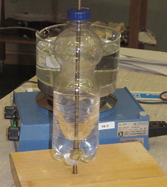 | Abb. 48: Ein langsam laufender Motor (Scheibenläufer) und ein schräg auf die Welle gesteckter Holzstab bilden das Rührsystem. Im Gefäß aus DURAN mit 18 cm Durchmesser befinden sich 1,5 Liter Wasser, ca. 6 cm hoch. (FB) | ||||||||||||||||||||||||||||||