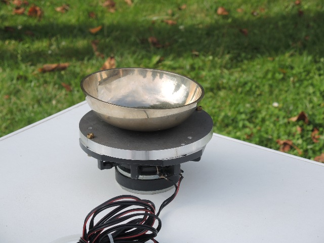 Kerzenständer angeregt durch Lautsprecher ohne Membrane, nur mit Kalotte bei 1400 Hz. Gitter mit 8 radialen Stukturen Beobachtung: Auf den Strukturen ist der 1400 Hz-Ton viel deutlicher zu hören. |