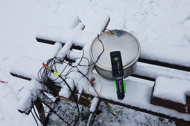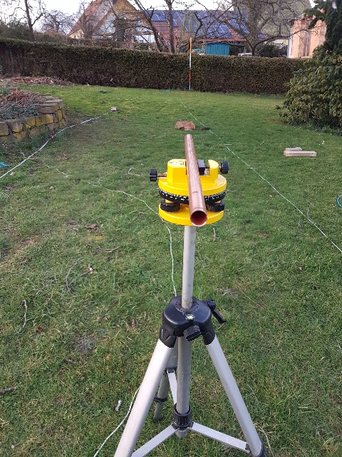 Flachspule 100 mm, Fa. Schwille. Bei dieser Ausrichtung gibt es auf der Südseite der Flachspule (hinter der Kamera) eine lange schlauchförmige Struktur bis zum Zaun am Rand des Grundstücks. Der "Nordwind" wird also durchgelassen. Für ihn ist die Spule CW gewickelt. View to the north. Flat coil 100 mm, Fa. Schwille. With this orientation, there is a long hose-like structure on the south side of the flat coil (behind the camera) up to the fence at the edge of the property. The "north wind" is thus let through. For him, the coil is wound CW. (FB) |
