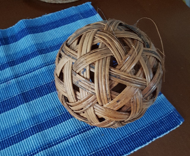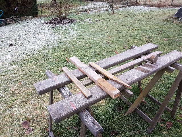 dem Tisch ein Holzgestell mit zwei Kupferringen,