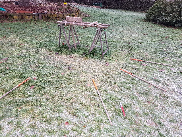 isoliertem Kupferdraht Breite 2.4 m, Höhe 2.0 m Links unten ist an beiden Enden des Drahtes jeweils ein Bananenstecker, mit denen man einen elektrischen Kurzschluß erzeugen oder einen veränderlichen Abschlußwiderstand anschließen kann. An archway made of wood and insulated copper wire Width 2.4 m, height 2.0 m At the bottom left, at each end of the wire is a banana plug, with which you can create an electrical short circuit or connect a variable terminating resistor. (FB) |