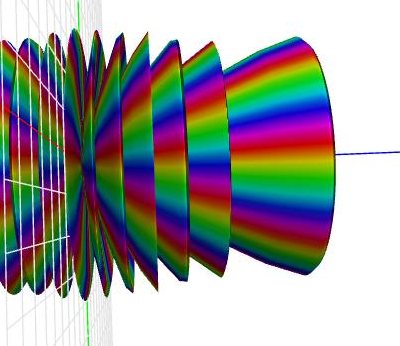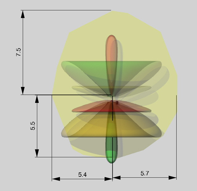 | Abb. 06-06-12: 2671 Hz, Einige der im Nahbereich gefundenen Richtungen sind nach außen verlängert. Die Winkelhalbierenden dazwischen sind mit dünnen blauen markiert. Von Topf aus nach außen gibt es eine Abfolge von zweischaligen Zonen mit jeweils wechselnden Qualitäten (blau und gelb). Von den dreien mit den kräftigen Farben sind die gefundenen radialen Maße aus der Tabelle übernommen worden. Die azimutalen Breiten sind nur schematisch. (0,9 m) Je weiter man nach außen kommt, um so mehr dieser Zonen sind zu beobachten, die sich auf Winkelhalbierenden zwischen den gemessenen Abstrahlrichtungen anordnen. (FB) |
