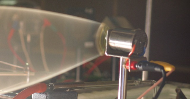 Minuspol am Flügel und der Pluspol am Gehäuse. Das Gerät steht parallel zum Tisch (Ost-West-Achse). Es gibt eine Strömung, die von der Oberseite des Flügels nach oben geht. (FB) |