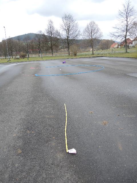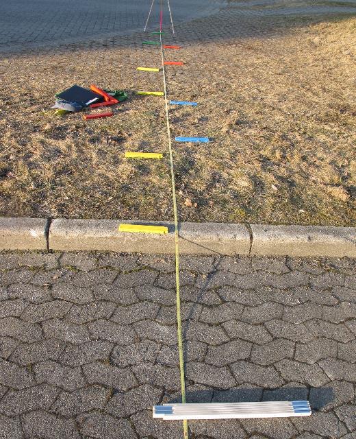 ausgemessen. Von links nach rechts ist jeweils Beginn und Ende einer Gruppe aufgetragen, nach oben die Position in Meter. Die Gruppen beginnen einheitlich mit der gleichen Qualität: EAT2. (Zählung der ausgelegten Marken fortlaufend: Beginn mit 1, Ende bei 5 , Beginn der nächsten Gruppe bei 6 , Ende bei 10 usw. ) Bei zwei Meßreihen mit kürzeren Abständen konnte fünf Gruppen beobachtet werden, bei den anderen vier. Der Zaun am Grundstücksende begrenzte die Messungen. Die Größe der Strukturen ist nicht konstant. Sie schwankt innerhalb eines Tages, vermutlich ändert sich die äußere Anregung. Innerhalb der Daten einer Messung scheint es einen streng monotonen Zusammenhang zu geben, wie die Ausgleichsgeraden vermuten lassen. Die Steigung hängt allerdings vom Zeitpunkt ab. Bei der Reihe mit den grünen Datenpunkten sind auch die Werte für die Struktur innerhalb der ersten Gruppe eingesetzt. Auch sie lassen sich mit der Ausgleichsgeraden beschreiben. (FB) |