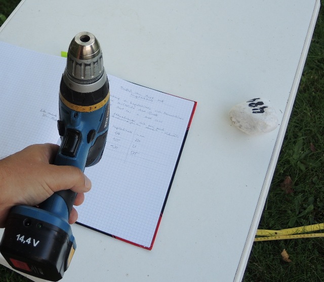 Akkuschrauber, etwa 30 cm neben dem Stein gehalten, Auf die Welle gesehen bedeutet bei dieser Stellung: bei "rechts" CCW. (FB) |