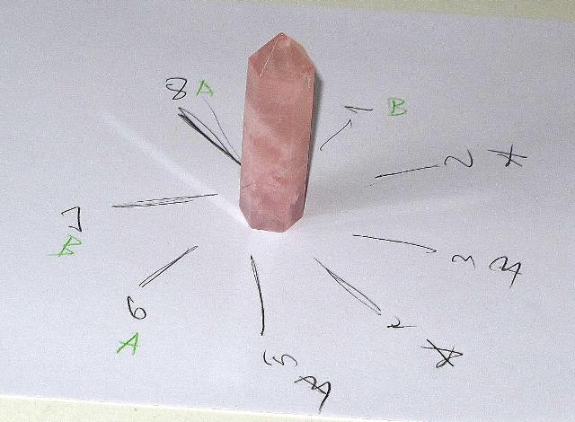 Protokollnotizen, Rosenquarz steht. A.M sucht Strukturen wie "Windmühlenflügel" es gibt acht Strukturen 2 x 4 A und B sie gehen bis 75 - 80 cm nach außen. F.B. spürt weiter k+ (B) bis 140 cm und k- (A) bis 95 cm F.B. und A.M. "sehen" die Strukturen um Kristall. F.B. "sieht" Zonen: MAT2 MAL2 und Strahlungen Antineutrino µ und k- A.M. "sieht" Zonen: EAL2 und EAT2 und Strahlungen Antineutrino e und k+ "Tulpen" nicht nachgeprüft. (FB) |
