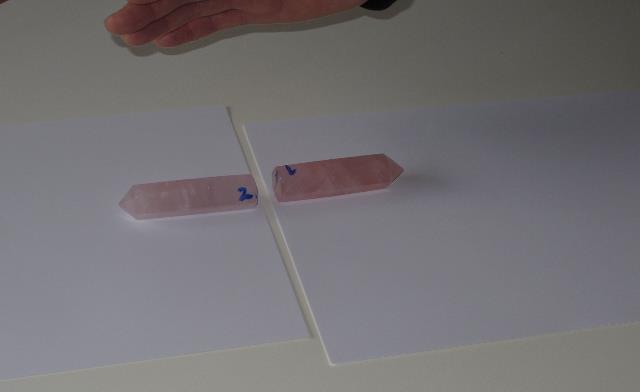 auf der weißen sechseckigen Holzplatte. Von ihnen gehen mehrere spürbare Streifen auf, im Foto etwa im Winkel von 45 Grad, Richtung und Breite markiert durch die beiden gelben Maßstäbe. Der blaue Stab zeigt auf die Mitte zwischen den beiden Kristallen und senkrecht zu deren Achsen. (FB) |