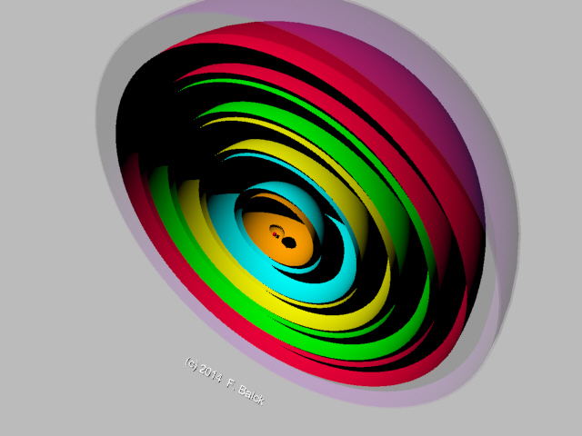 innerhalb der Struktur: Es gibt ausgehend vom Zentrum mit dem Rosenquarz vier "Trennebenen", die bis zur äußeren Kugelschale reichen. Von oben sehen sie aus wie ein "Malteserkreuz". Man findet zwei unterschiedliche Qualitäten: (braun) und (grün) Gegenüberliegende "Flügel" haben gleiche Qualität und die dazu im Winkel von 90 Grad stehen eine andere. Die "Flügel" unterbrechen die inneren Elemente. An diesen Ebenen wechseln die Elemente paarweise ihre Qualitäten. (grün <--> rot und blau <--> gelb) Die gesamte Struktur dreht sich um die Achse des Malteserkreuzes gegen den Uhrzeigersinn in einer Zeit von einigen Minuten pro Umdrehung. (FB) |