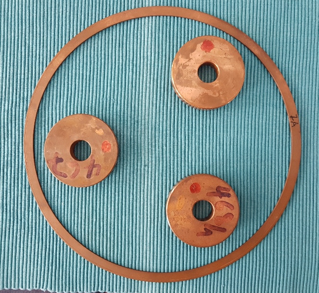 Kupferscheiben mit Bohrung, Ziehrichtung nach oben, in der Mitte ein gestanztes Kupferstück, Richtung nach oben (FB) |