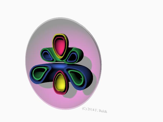 Kapitel-03-03 Beobachtungen: Die zweischaligen Strukturen bestehen aus den Elementen Orbital und Torus. Es gibt jeweils einen Satz in der oberen und einen in der unteren Hälfte. Die Drehachse verläuft in diesem Bild senkrecht, d.h. im Vergleich zur Erde wäre diese Elemente nördlich und südlich von der Ebene durch den Äquator. Umgeben sind die Strukturen von einem Kugelorbital, das die Ausdehnung der Strukturen nach außen wie eine äußere Schale begrenzt. Hier im Bild ist im Vergleich zum Zustand ohne Rotatin der obere Doppeltorus geschrumpft, der untere gewachsen. (FB) |