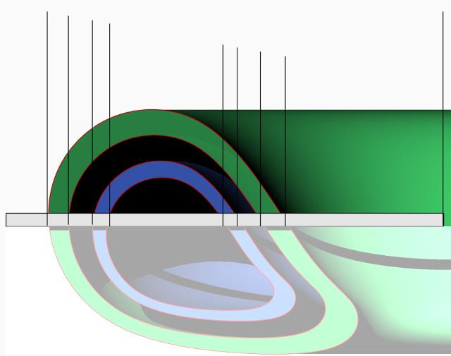 zweischalige Struktur, Der gelbe Kreis markiert die Lage des äußeren Randes vom blauen Zylinders bei stillstehendem Leiter. Bei dieser Drehrichtung und Polarität des Stromes (blau) ist die Struktur größer als bei Stillstand. Wechselt man die Drehrichtung oder die Polarität, dann ist die Struktur kleiner als in Ruhe. Wechselt man beides, dann erhält man den gleichen Zustand wie in der nächsten Abbildung. (FB) |