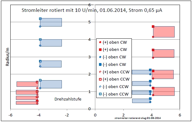von Drehrichtung und Polarität des Stromes. Es ist eine 3D-Strukturen (Doppeltorus) zu beobachten. Ausgemessen wurden 2D-Schnitte durch die 3D-Strukturen und zwar Innen- und Außenradius jeweils vom Innentorus und vom Außentorus, das ergibt acht Maße. Die Rechtecke markieren jeweils die Wandung vom einem Torus. Ergebnis: Bei Stillstand haben die Tori eine mittlere Größe. Sie wachsen bei Drehrichtung CW und Polarität (+) oben sowie bei CCW und (-) oben. Sie schrumpfen bei CCW und (+) oben sowie bei CW und (-) oben.