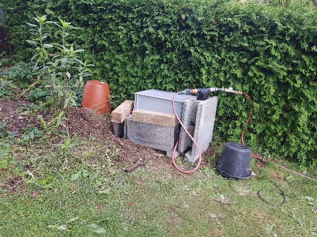 Trichter und Trinkbecher auf der rechten (West) Seite . Das Wasser fließt durch das leicht geneigte HT-Rohr nach Osten in den Eimer. (FB) |