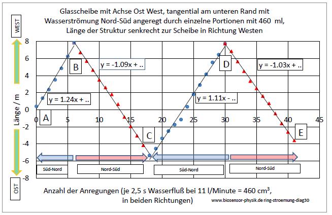 Strömung Ost-West jeweils gleiche Portionen zu 340 ml aus einem Becher Wasser, eingefüllt in einen Trichter, mal fließt das Wasser von Ost nach West (rot), mal von West nach Ost (blau) Im Vergleich zu der Anordnung Nord-Süd Die Abstände zwischen den Punkten in den Abschnitten B-C und C-D sind unterschiedlich. FB) |